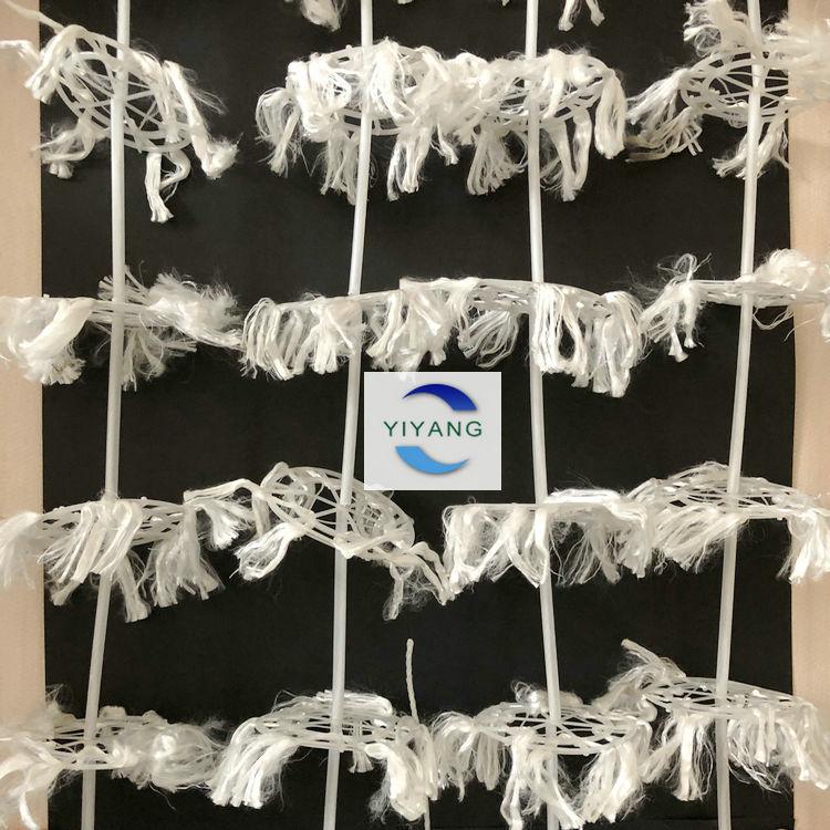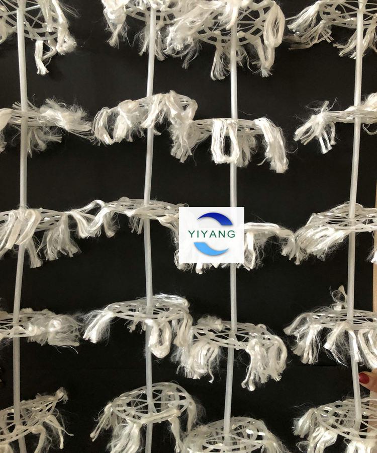 組合式填料又叫做組合式多孔環(huán)掛膜填料,產(chǎn)品由塑料環(huán)、維綸絲、中心塑料繩組成,產(chǎn)品材質(zhì)為全塑型夾片維綸醛化絲。成串狀的組合式填料每條上面有多個組合式填料片分布,有固定間距8公分、10公分。每束維綸絲串通4個方形孔,這樣醛化絲在塑料環(huán)上的牢固度就比較高了,在強大的曝氣湍急的水氣流的情況下,仍然能正常工作。